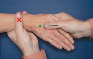 در این تست درمانگر دست بیمار را به  صورت غیر فعال به انحراف اولنا ( ulnar deviation) و کمی اکستنشن برده یک نیروی عمودی اعمال می کند، درصورت ایجاد درد در قسمت داخلی مچ دست تست مثبت است( شکل ۳).