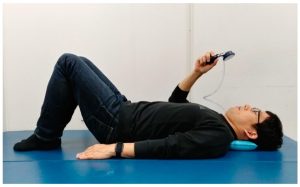 - به منظور تمرین کنترل حرکتی عضلات فلکسور عمقی گردن (دراز گردنی و دراز سری) میتوان از تمرین Chin Tuck با استفاده از یک فشار سنج زیر سر و گردن موسوم به Pressure Biofeedback Unit بهره برد، به این صورت که پس از آموزش نحوهی انجام تمرین به بیمار، از او میخواهیم که تمرین را انجام دهد و مقدار فشاری که به دستگاه در اثر انجام تمرین وارد میشود را مشاهده کند (شکل شماره ۳).