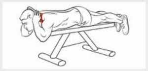 - به محض امکان تمرینات تقویتی ایزومتریک این عضلات باید آغاز گردد ( فرد دمر روی تخت بخوابد به گونهای که سر و گردن او از تخت بیرون باشد و در این حالت سعی کند گردن را بر خلاف جاذبه در وضعیت نرمال خود نگه دارد و نگذارد که سر بیافتد – شکل شماره ۴).