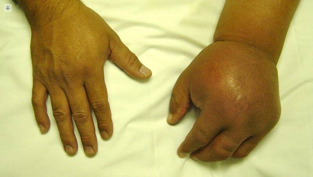 شکل شماره ۳ : تورم موضعی (دست راست بیمار) از علائم بیماری است.