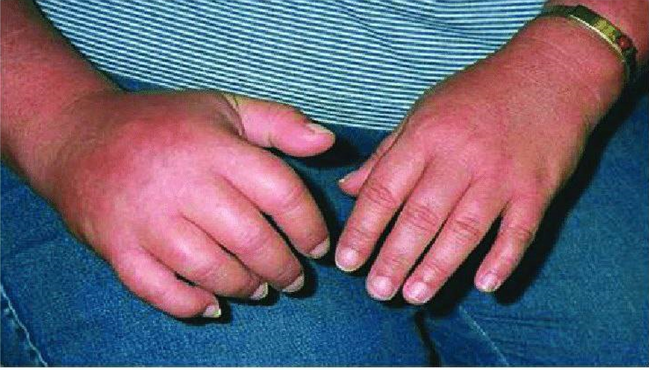 شکل شماره ۱ : درگیری و علائم تورم را در دست چپ بیمار مشاهده میکنیم.